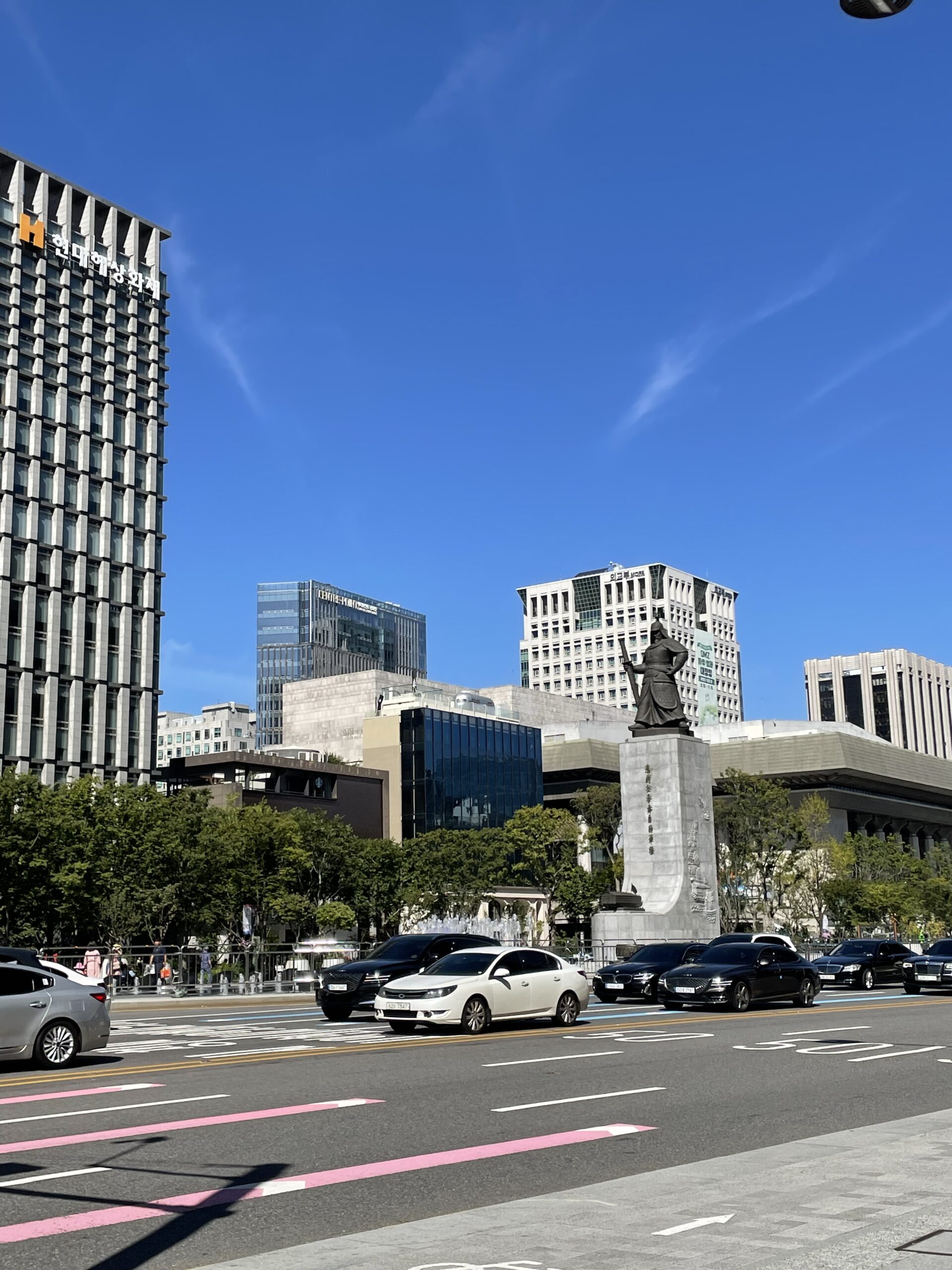 Along the way, we took several photos including the Bigak, which is a monument built to honour King Gojong. This king was the one responsible for changing the name of Deoksugung Palace. Further down the road, as we were approaching the palace, we also found two statues, one by the side of the road, the other right smack in the middle of this thoroughfare.