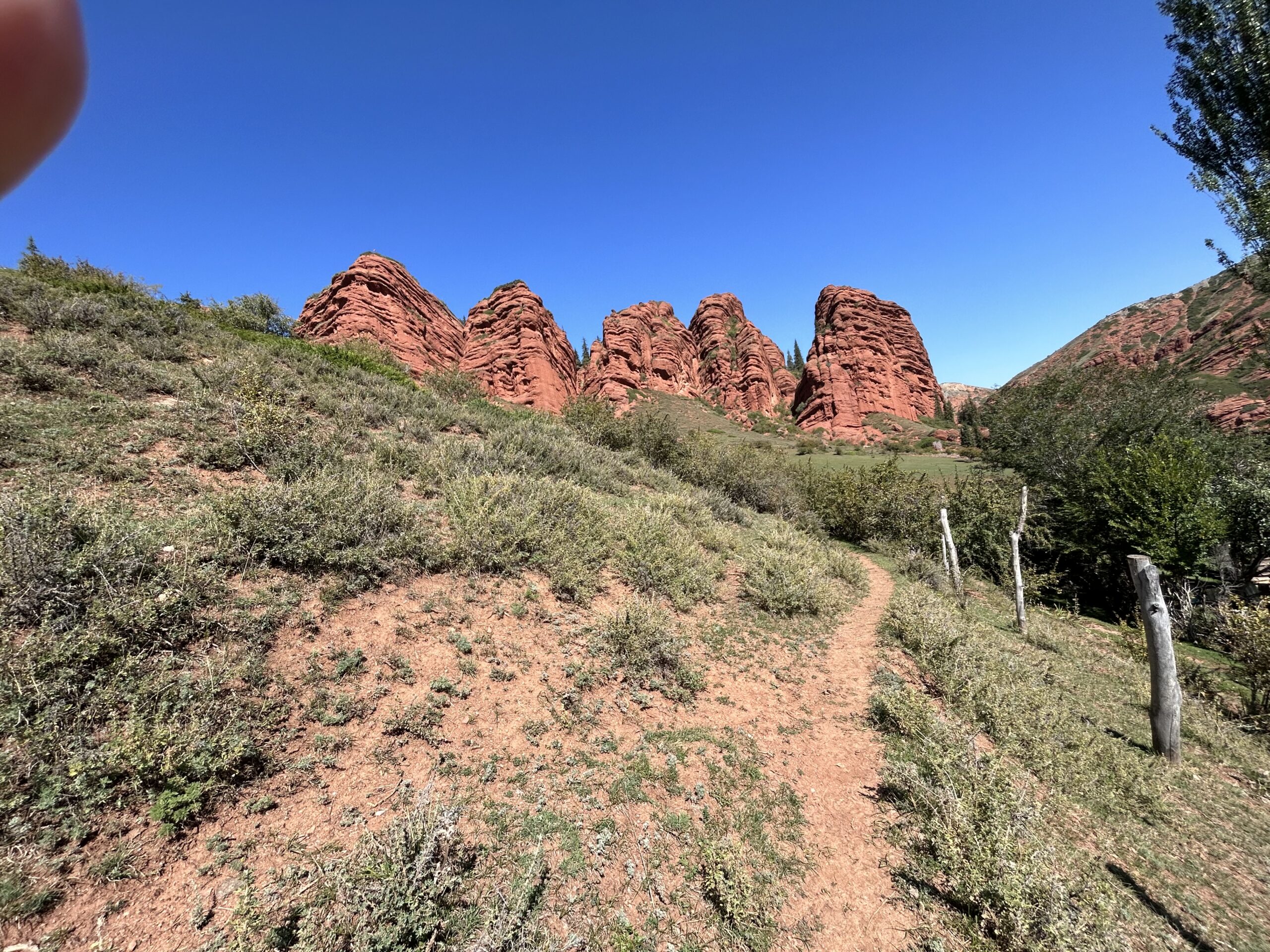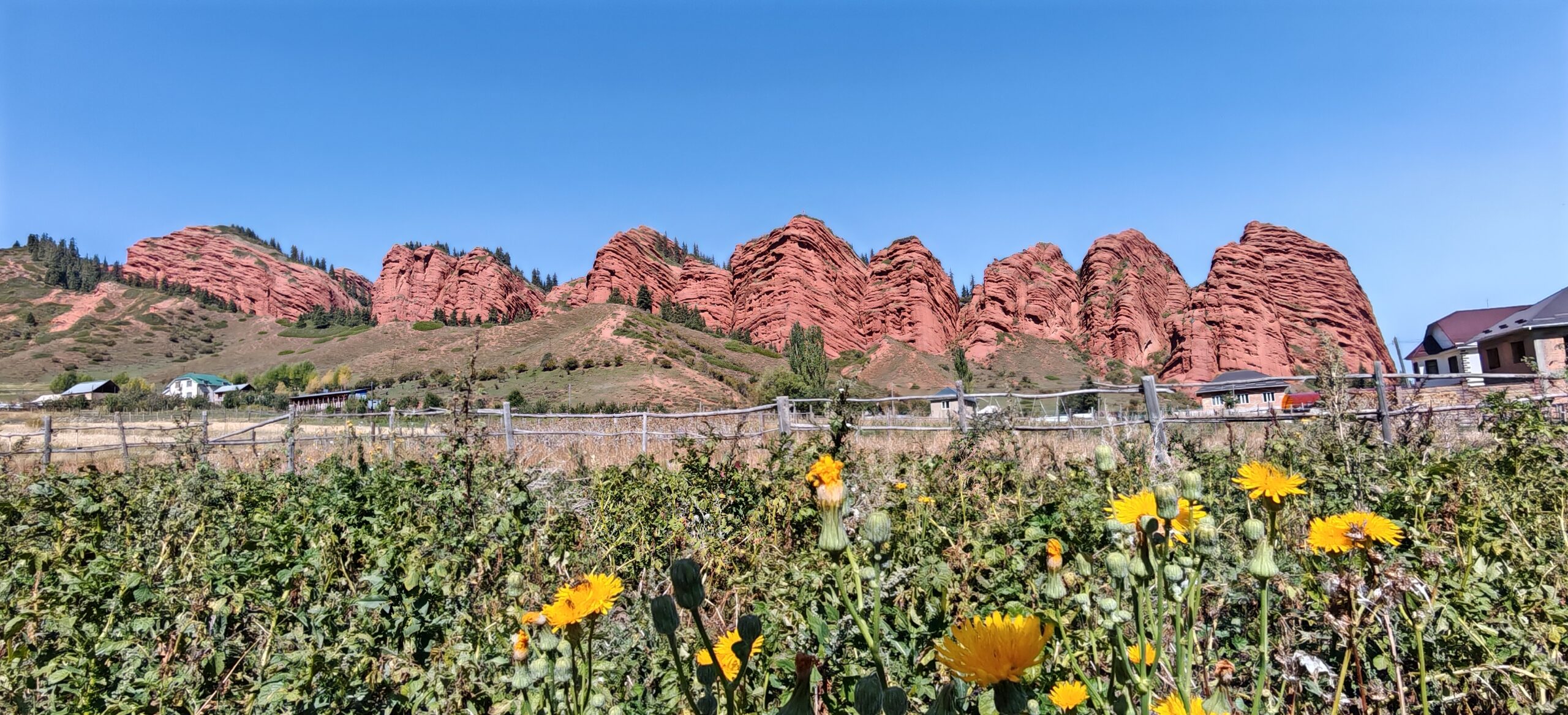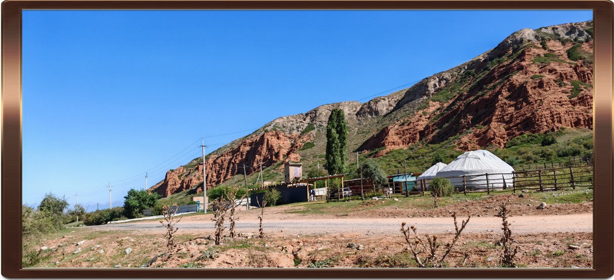 As usual, we stopped along the way whenever we saw something unique or exciting, to take some photos. The river that accompanied us along the road nearer to the village of Jeti Oguz was such a stop. And as we got nearer to the village, we could see the surrounding cliffs with their exposed slopes in bright orange-red colours.