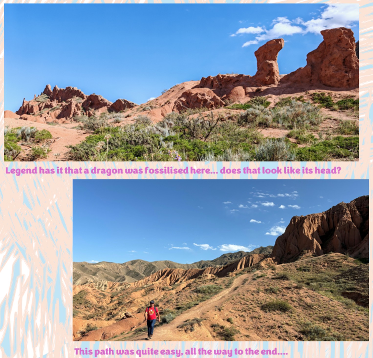 The Seven Bulls Rock was certainly unique, literally appearing in-your-face at the village of Jeti Oguz. It was like the entire rock formation was carved into the landscape by some ancient civilisation, and the scars of that were left for us to figure out. Skazka was something else too, very unlike the earlier canyon we visited. We should also take into account the tale of a legendary dragon that once ruled the area and how it was fossilized into the canyon, where some of the formations seem to suggest its head, body and tail – if you can just allow your imagination run wild!