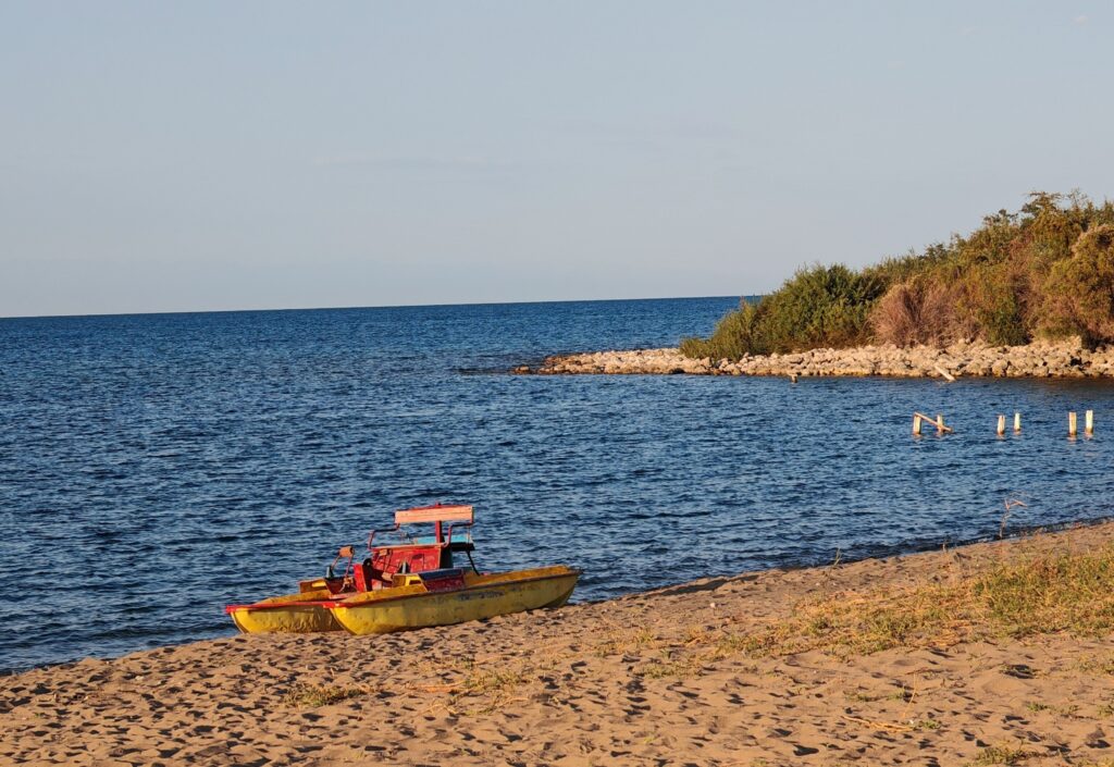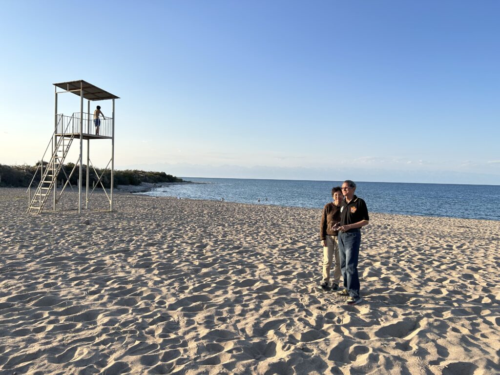 After a good hike, we joined up with MIL and made our way out of the canyon grounds and rejoined the highway, heading westward towards Bokonbayevo. By this time, we really didn’t have any more plans to stop for photographs – we just wanted to get to Sonun as soon as possible. The road in was quite bumpy and when we got near, we noticed that there was an almost private beach just off the trail. The sun was barely hanging on in the sky, but the sight of the beach and the chance to touch the waters of Issyk Kul, meant that we made that detour.