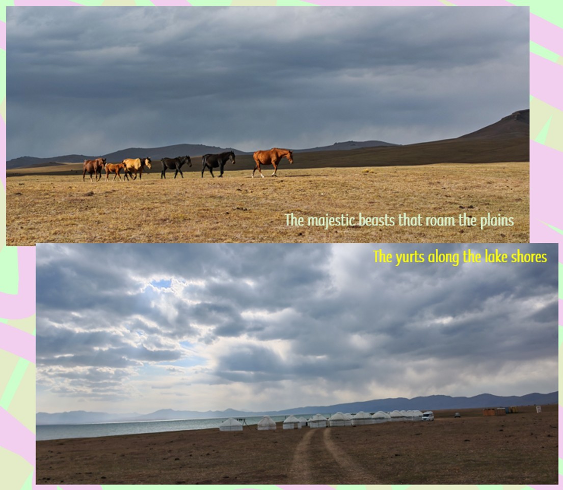 After two plus hours of hard driving, we finally caught glimpses of Song-Kul, an alpine lake which is frozen for most periods of the year due to its location at an altitude of over 3000m above sea level. To get to it, we had to drive off the ‘main road’ into an open grassy plain, while the main road continued to snake away into the horizon. Years of vehicular travel over the grassy plains had created dirt tracks. We chose the easiest track directly to the lakeside. There were clusters of yurts along the shores – some were vacation homes, while horses and cattle roamed the surrounding plains.