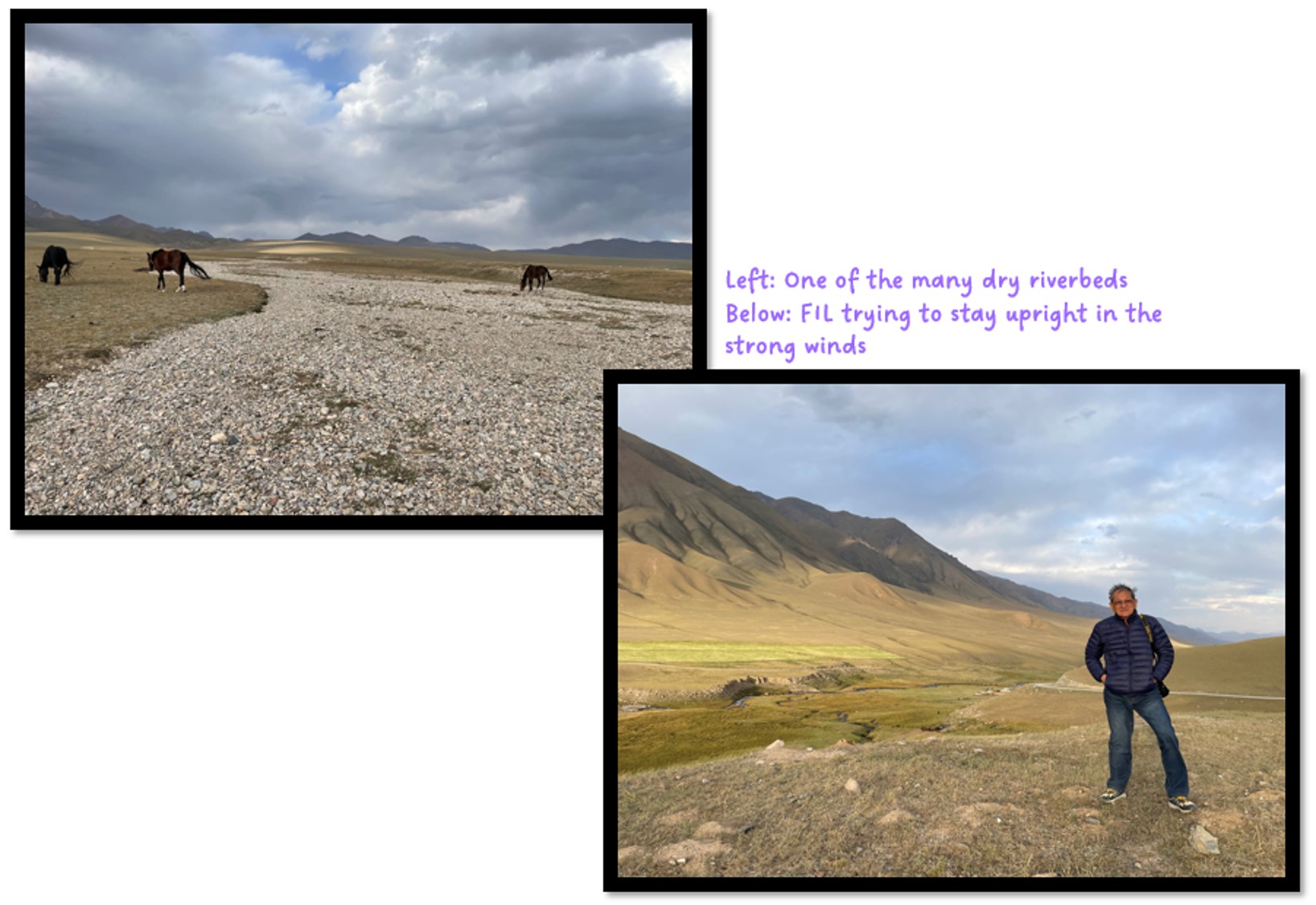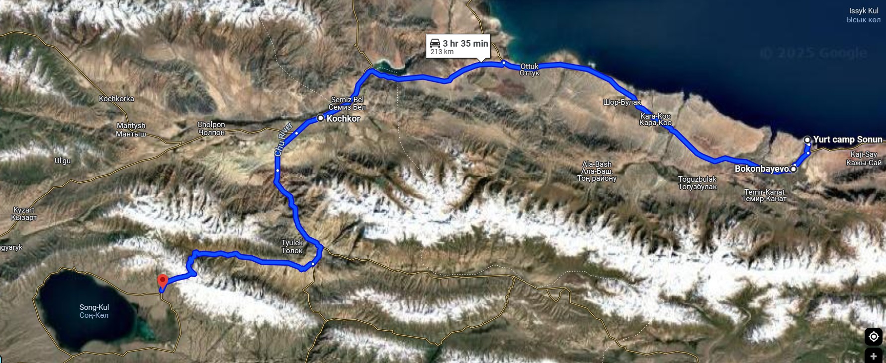 Founded in 1909 and originally named Stolypino, it changed its name to Kochkor in 1917 and has stuck to this name for the last one hundred plus years. With a population of less than 12,000 people, it has become a base for tourism activities in the region. We stopped here for lunch before embarking on a long south-westerly route towards Song-Kul, a lake no more than 5% the size of Issyk Kul! The distance was approximately 90km, but the going was very slow due to the road condition, the worst so far on the trip. Almost the entire way, the road was not paved – just huge stones arranged with loose stones and pebbles. It was bumpy and uneven, and the road had many potholes, plus the weather was quite bad, certainly a recipe for a disaster.