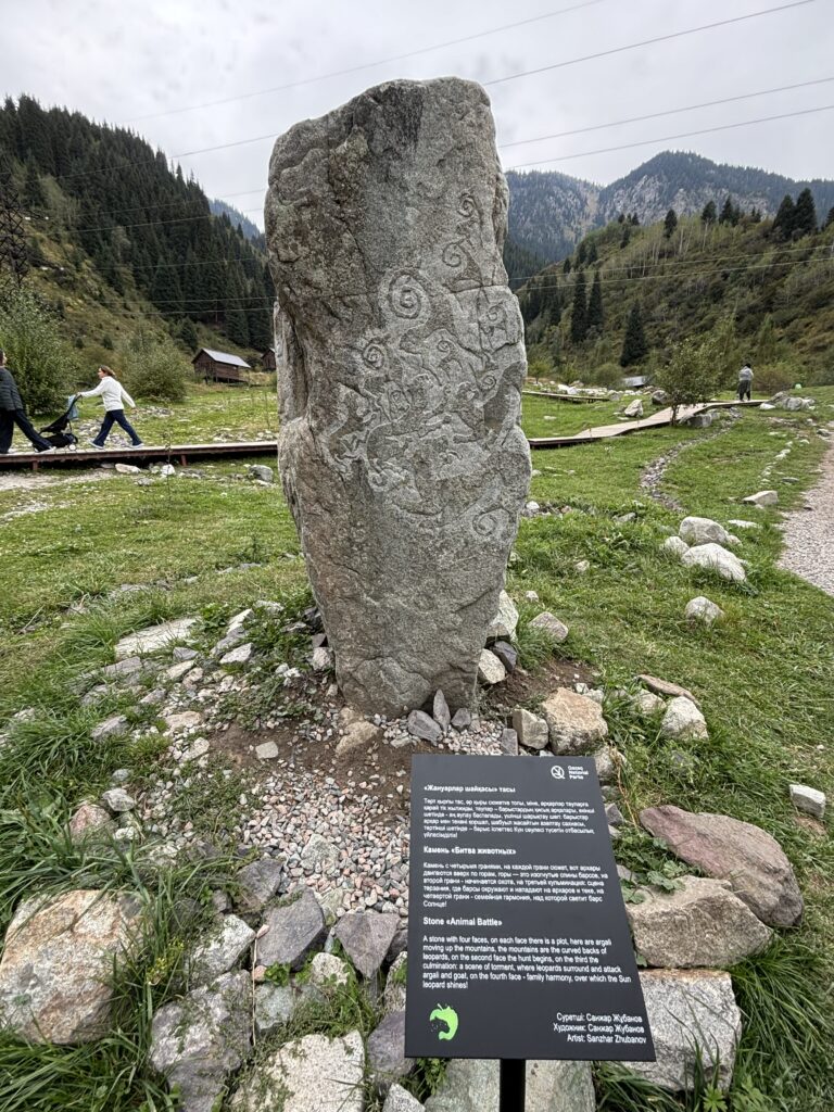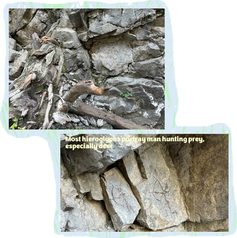 There was a pathway behind the Visitor Centre which led to Ayusai Waterfall nearby, but it is pretty evident that the river was not really in full flow. But what was more interesting than the waterfall were the hieroglyphs carved into the stone walls of the waterfall – clearly visible, but some were defaced or vandalised. There may have been many more, but perhaps time and water flow could have erased them. Some were etched into boulders – such as the one depicting a story about leopards hunting the argali, a type of ram, which was erected at the entrance to the waterfall.