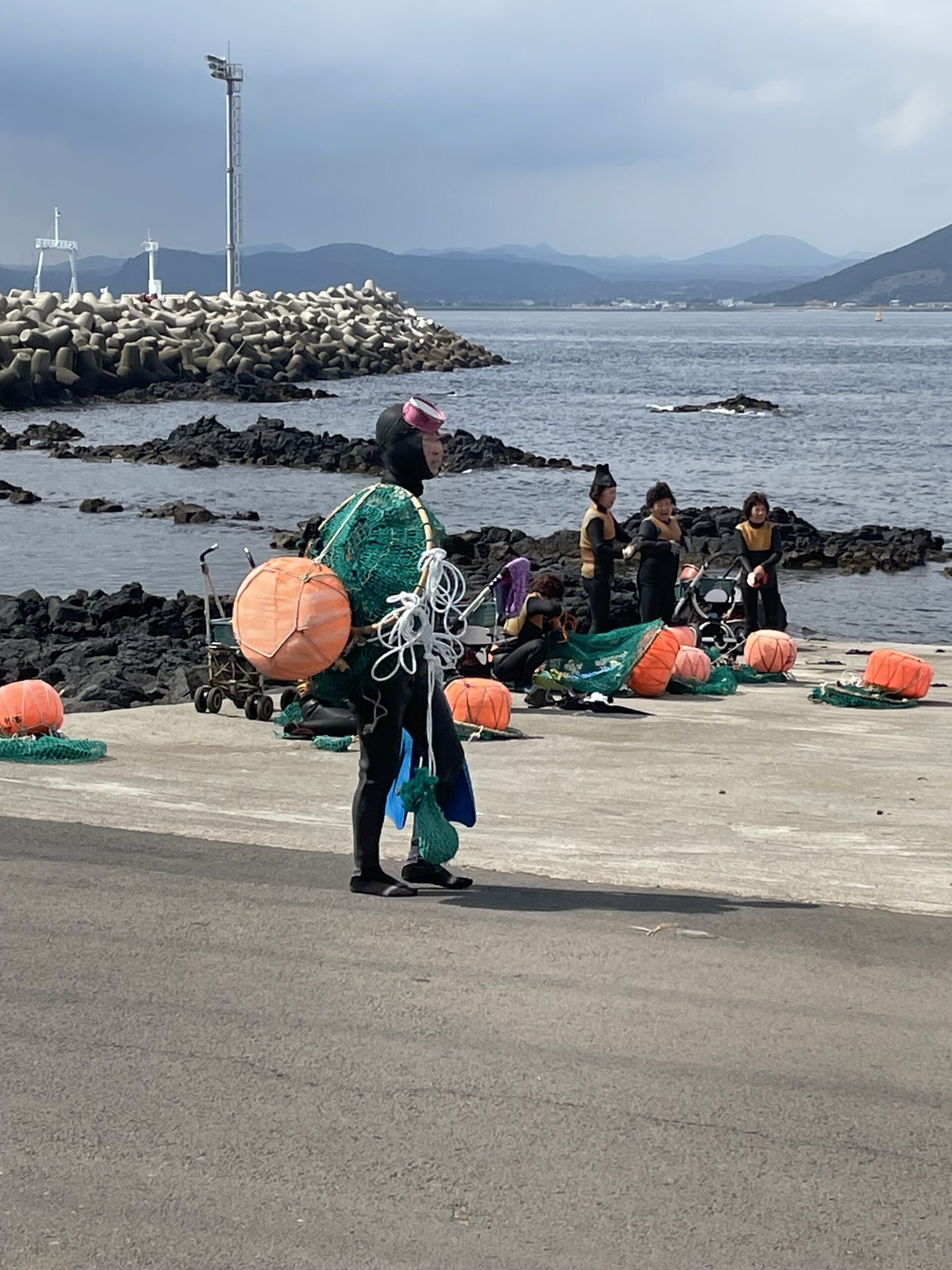 The island is famous for the Haenyeo, lady divers who go out among the shallow reefs off the coast of the island to forage and hunt for fish, snails, abalone, sea cucumber, seaweed, lobster and whatever else they could get their hands on. They normally go out in groups and due to their daily habit of doing so, they have become very adept in staying underwater without any breathing apparatus for long periods of time. And they do so almost all year round, including during the winter months, especially with the availability of the common diving wetsuits. This tradition is slowly dying, however, as many younger ladies are now more educated and seek better opportunities in the cities. Over 98% of the existing group of Haenyeo today are 50 years old and above.