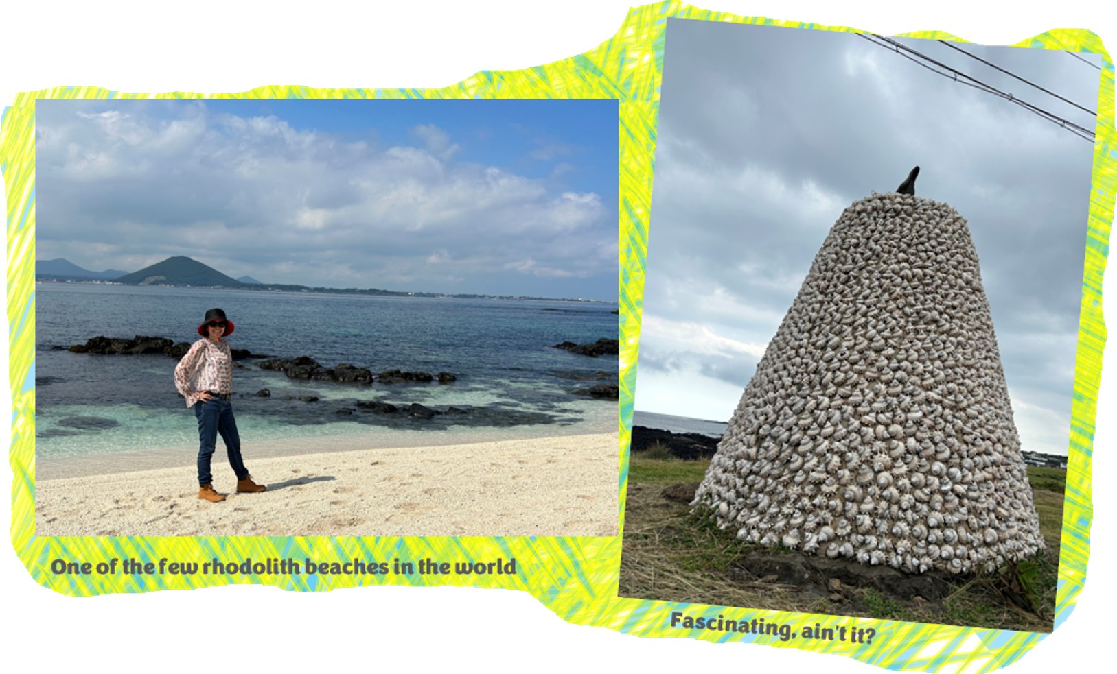 Then we discovered also the rhodolith beach named Seobin Baeksa Beach, a one of its kind wonder of the world – this is the only one in Asia. The beach is white in colour, but the “sand” is not exactly the granular sand in the normal sense of the word. It is actually calcified red algae, brought up from the bottom of the sea and deposited on the shore over thousands of years. It is a protected area, but we are allowed to go onto the beach.