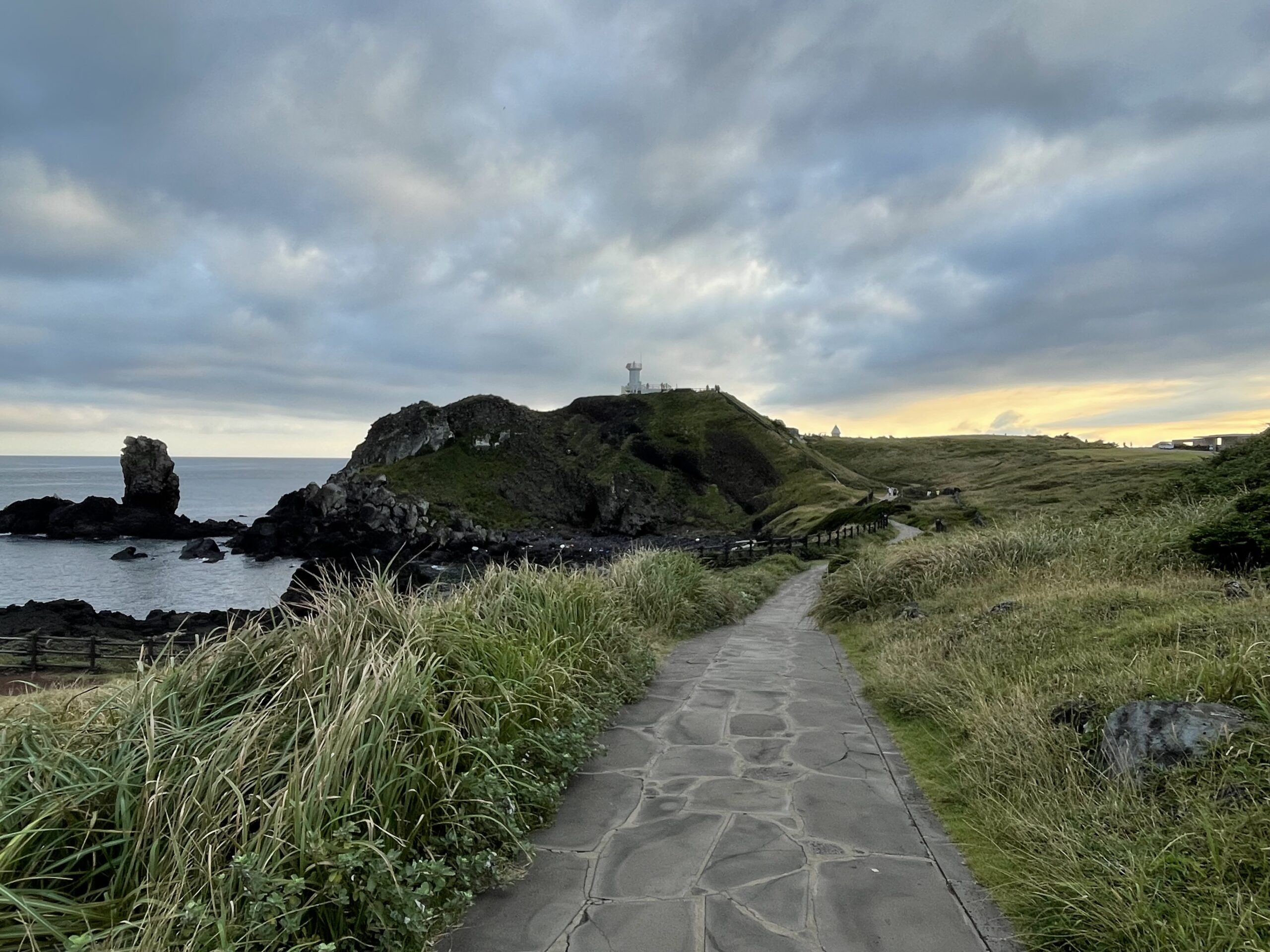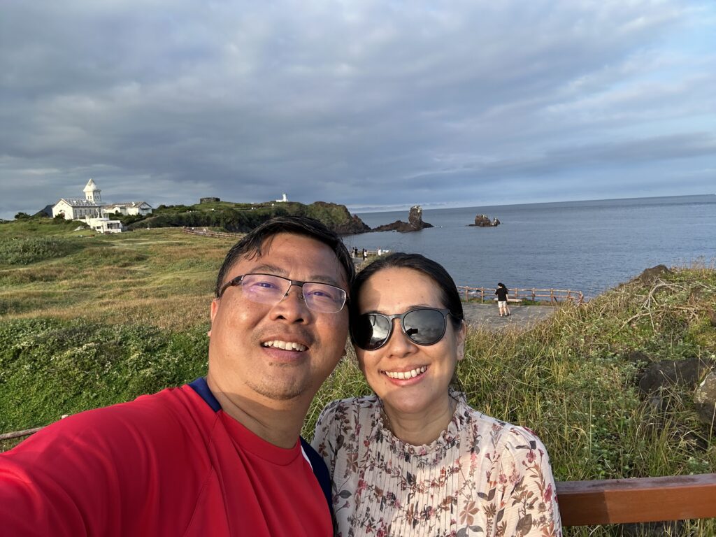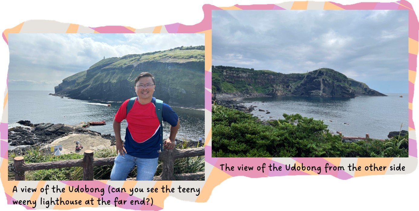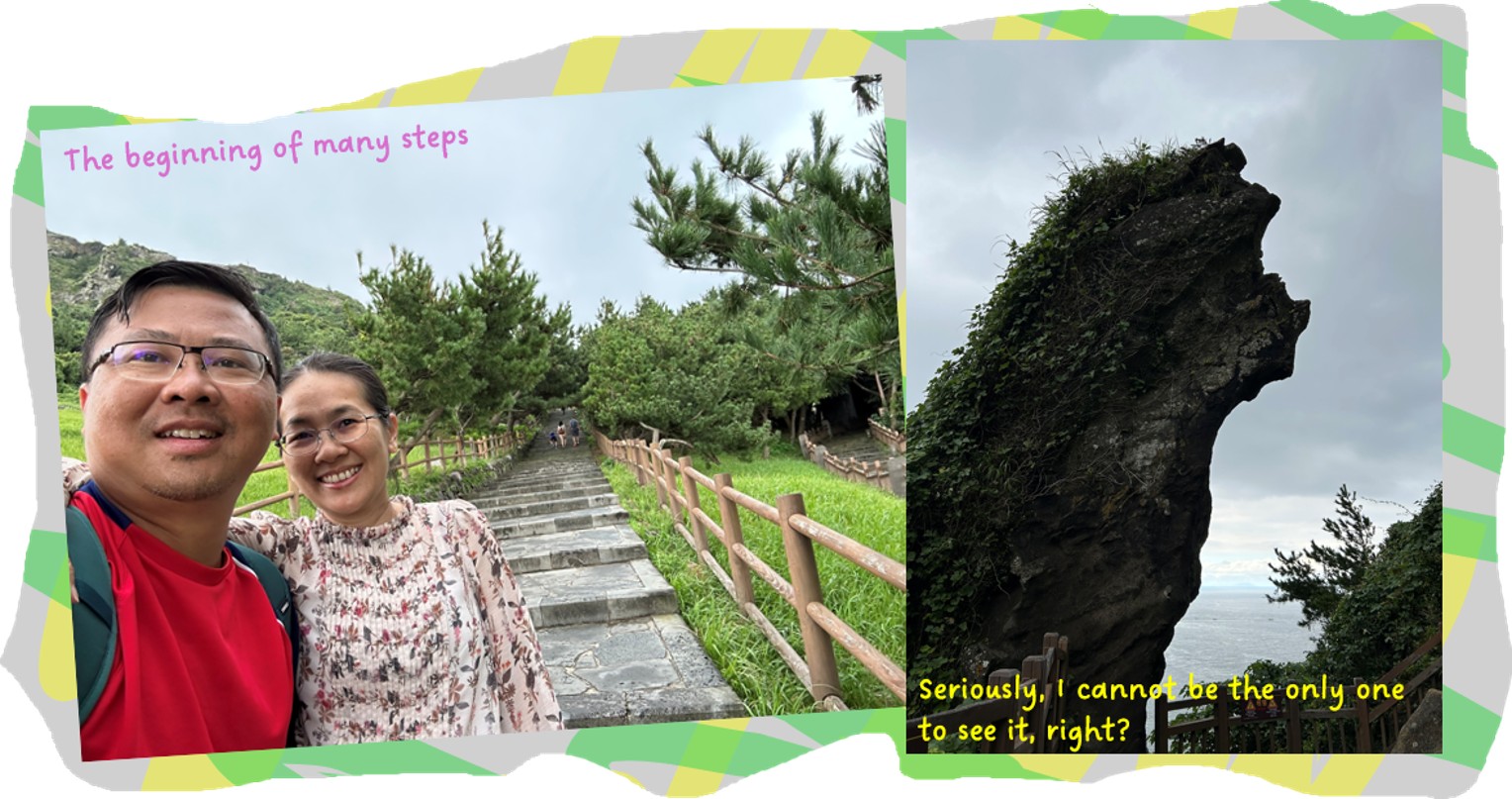 We arrived at the park and decided to take our time to hike up the many stone and wooden steps to the top, where we could view back down at the village, as well as to Udo Island and the Hallasan National Park. More than 1.4 million visitors came to the park in 2022, and is a popular destination for Koreans and foreigners alike. Along the way to the top, stands a rocky outcrop known as the Lamp Rock, or Deung Gyeong Dol, which resembles an ancient lamp. To me, it looked like something else….