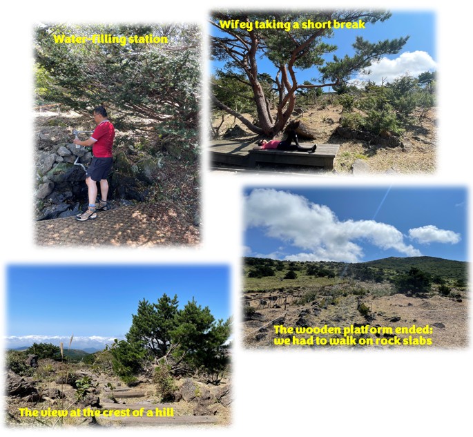 There were stops along the way, where we could fill our bottles with natural spring water and also places to rest before the uphill hike ahead. It didn’t look even remotely like the weather was going to turn bad, as the sun was beating down on us as we trudged our way along the wide wooden platforms that stretched as far as the eye could see, with the view of Hallasan Mountain almost always ahead of us. It was a pleasant walk, but alas, we came to a point along the trail and decided that we didn’t want to go on. So, we turned back and headed back to the car.