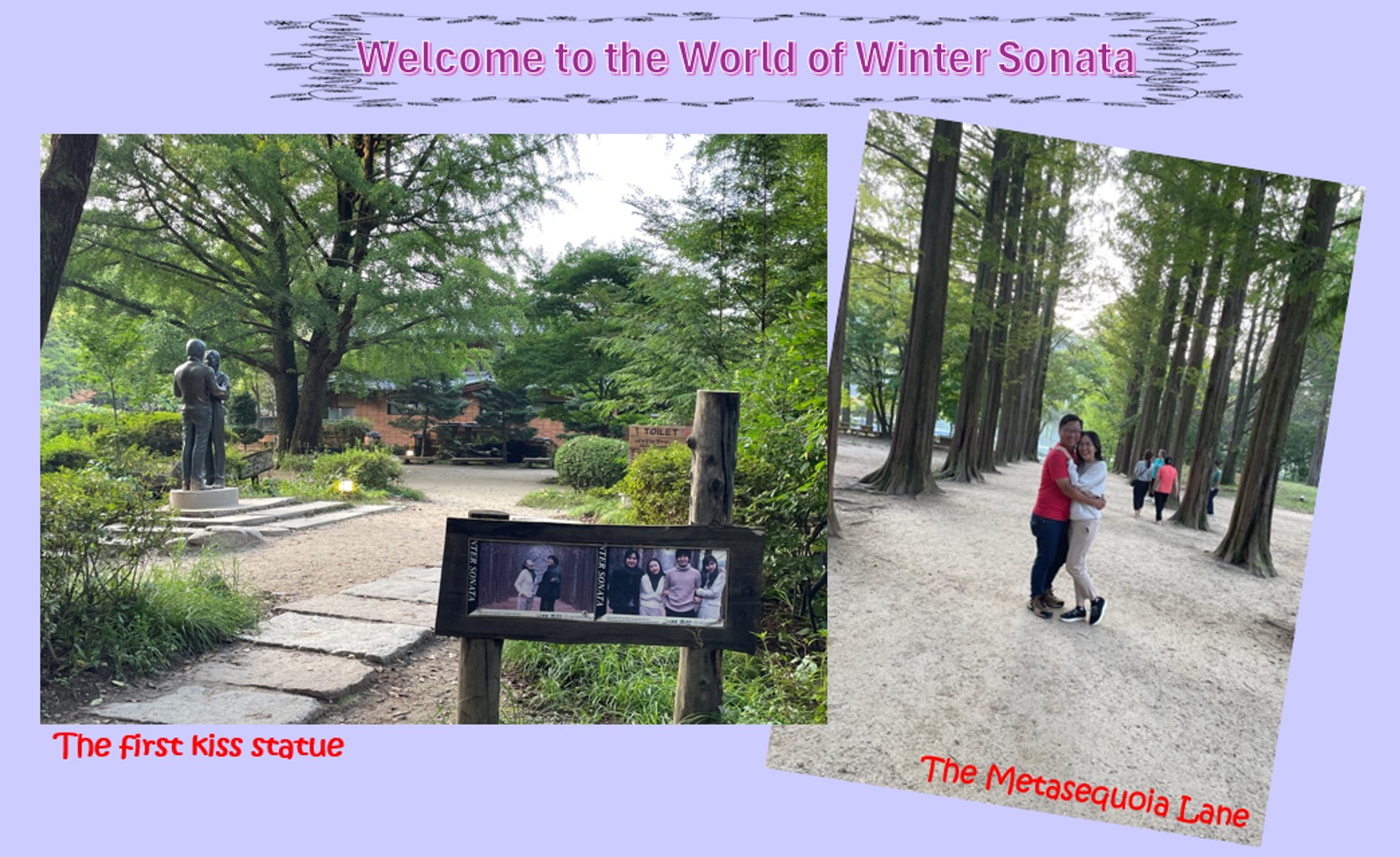 We had an early morning flight to catch, taking us back to Seoul for the remainder of the adventure.  We knew that by the time we settled back into the city, we would only have time to do one thing, and we chose to travel towards the east, about 2 hours away, to Nami Island, an almost “purpose-built” tourist destination, although it does have its own little history.  Nestled in one part of the Bukhang River, this half-moon shaped island attracts visitors from all over the world since it was popularised in the Korean romantic drama entitled “Winter Sonata” starring Bae Yong-joon and Choi Ji-woo.