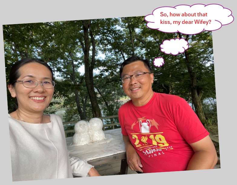 Apparently, in the drama, one of the scenes had the two main characters making mini snow figurines on a table, which they proceeded to push closer and closer as they talked, until the snow figurines “kissed”.  Well, I didn’t watch the drama (Bro. Ray: Readers please advise!), but perhaps it was a precursor to the “real” kiss later on in the drama?  Anyway, there are two permanent “snow figurines” made of concrete that had been painted white, which have been left on a table in the park.  We found that.
